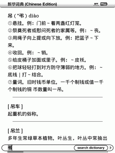 上次提供了一个按照笔划来查找生字的汉字字典,但是毕竟不能光标查询,不是很方便。现在kindle的固件升级到了3.4版,并且提供了汉字的光标查询字典功能。