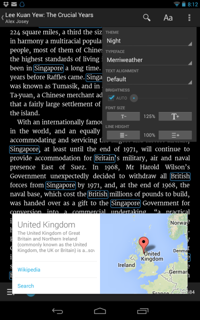 英文书倒是可以调整字体,查wiki,google翻译之类。但是体验各种诡异,google的卡片式ui神出鬼没,该有的时候没有,不该有的时候乱跳。