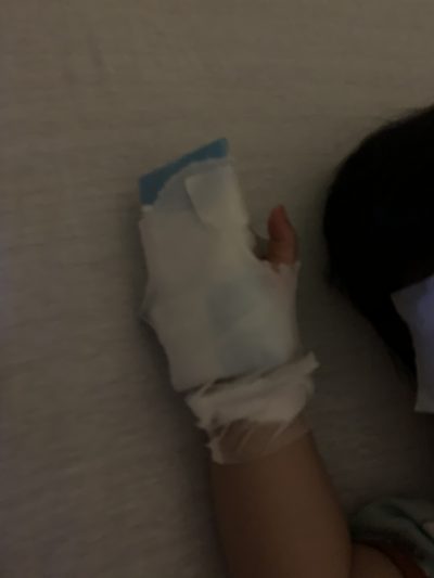 到病房以后宝宝又被带去扎留置针了,而且因为之前左右手都已经扎过了,医生在她手脚尝试扎了好几个地方才找到能放留置针的地方。我们在手术室外听宝宝哭了很久很久,心如刀割,回病房以后更是在宝宝手脚上看到好几个针眼。